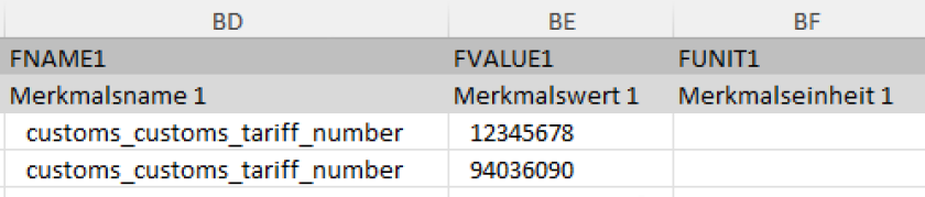 If you're using our Excel template for catalogue creation, enter the customs tariff number in the ‘products file’ in the columns FNAME1, FVALUE1, FNAME2, FVALUE2.